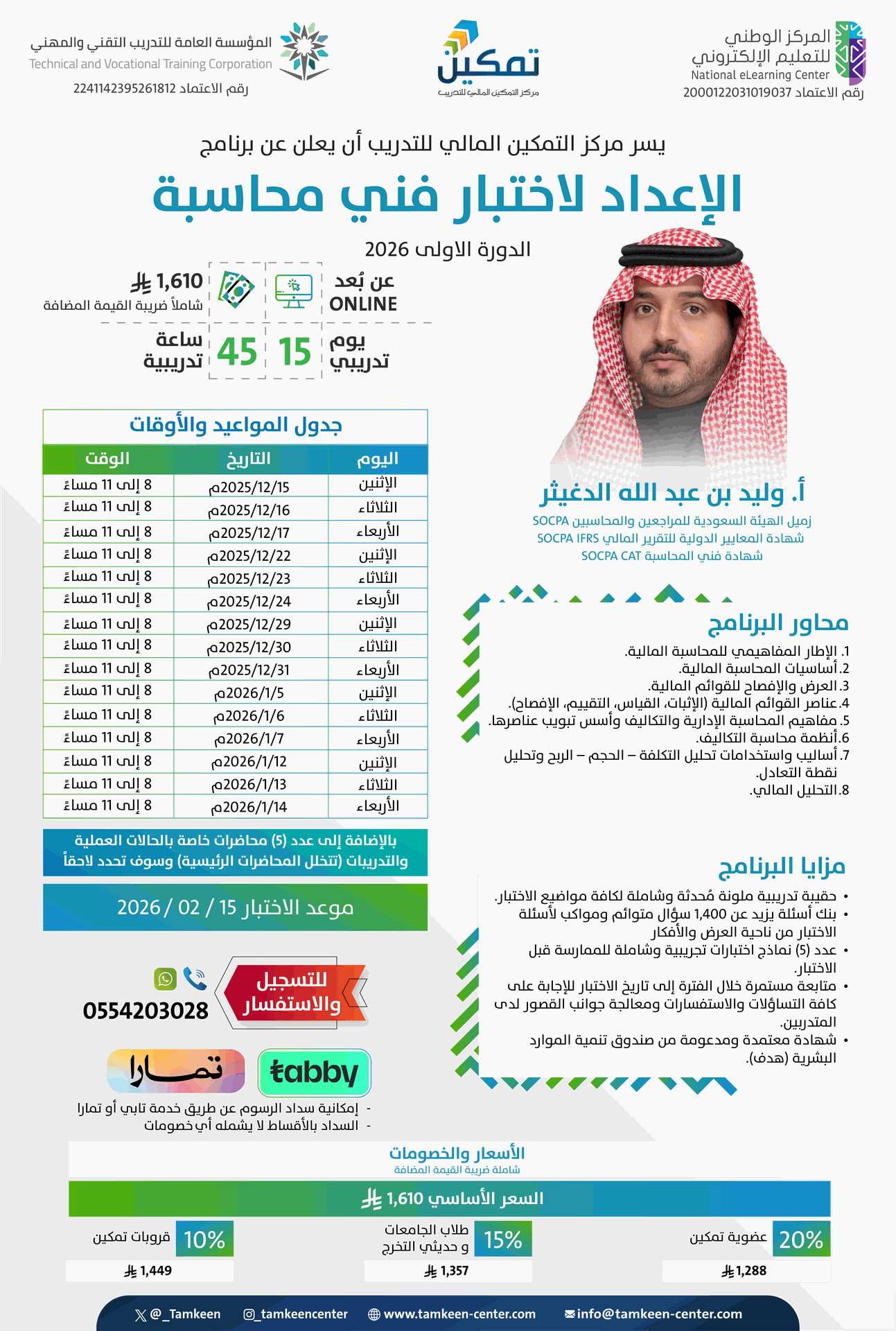 يهدف البرنامج إلى تأهيل المتقدمين لاجتياز اختبار فني محاسبة ضمن اختبارات الهيئة السعودية للمحاسبين والمراجعين SOCPA.