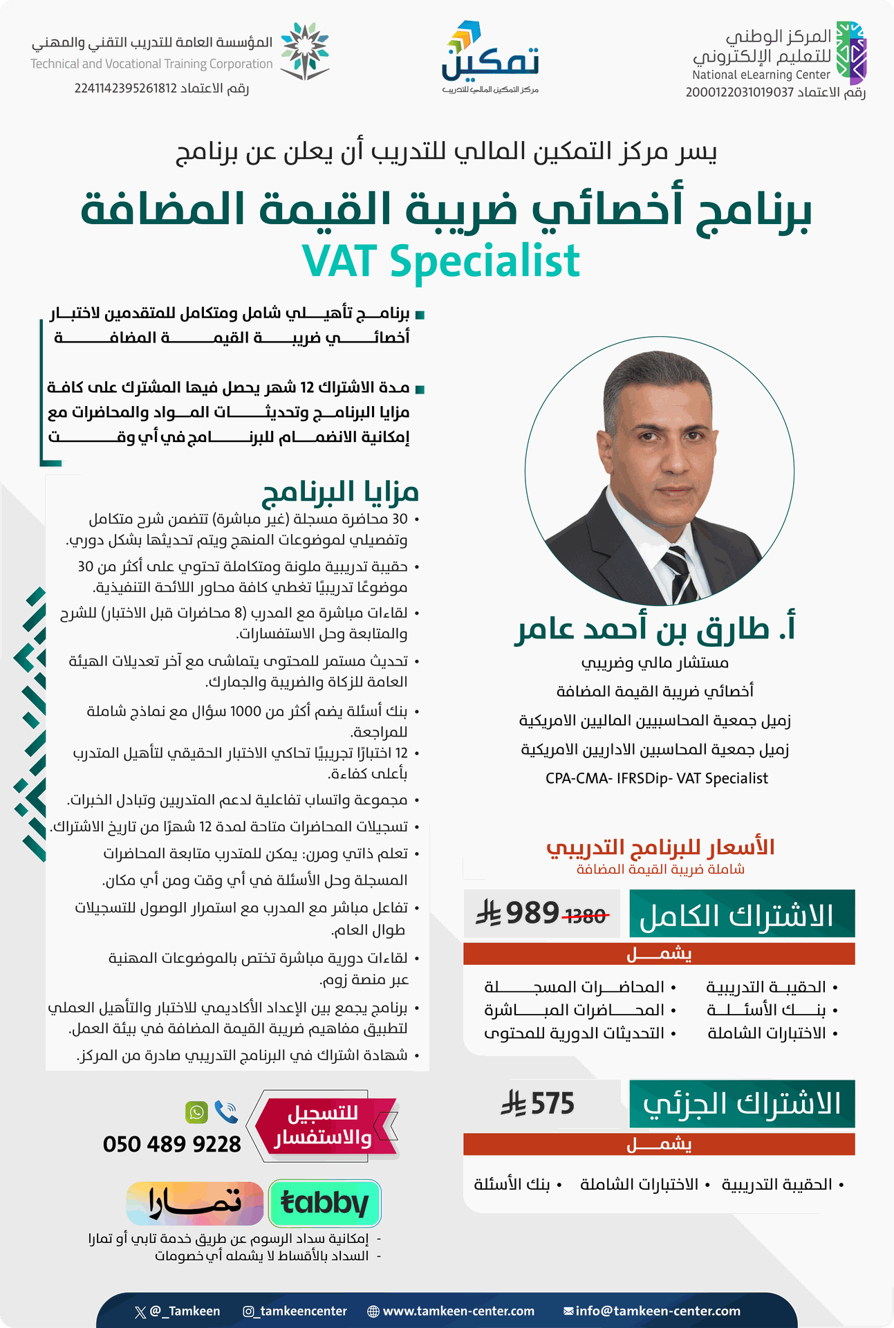 يتم في هذه الدورة شرح الإطار النظري والتطبيقي لضريبة القيمة المضافة بالإضافة إلى شرح المعالجات المحاسبية المتعلقة بها و الجوانب النظامية المحددة لحقوق والتزامات المكلف بضريبة القيمة المضافة مما يجعل المتدرب قادراً على إدارة العمليات المتعلقة بتطبيق ضريبة القيمة المضافة في المنشأة ،.