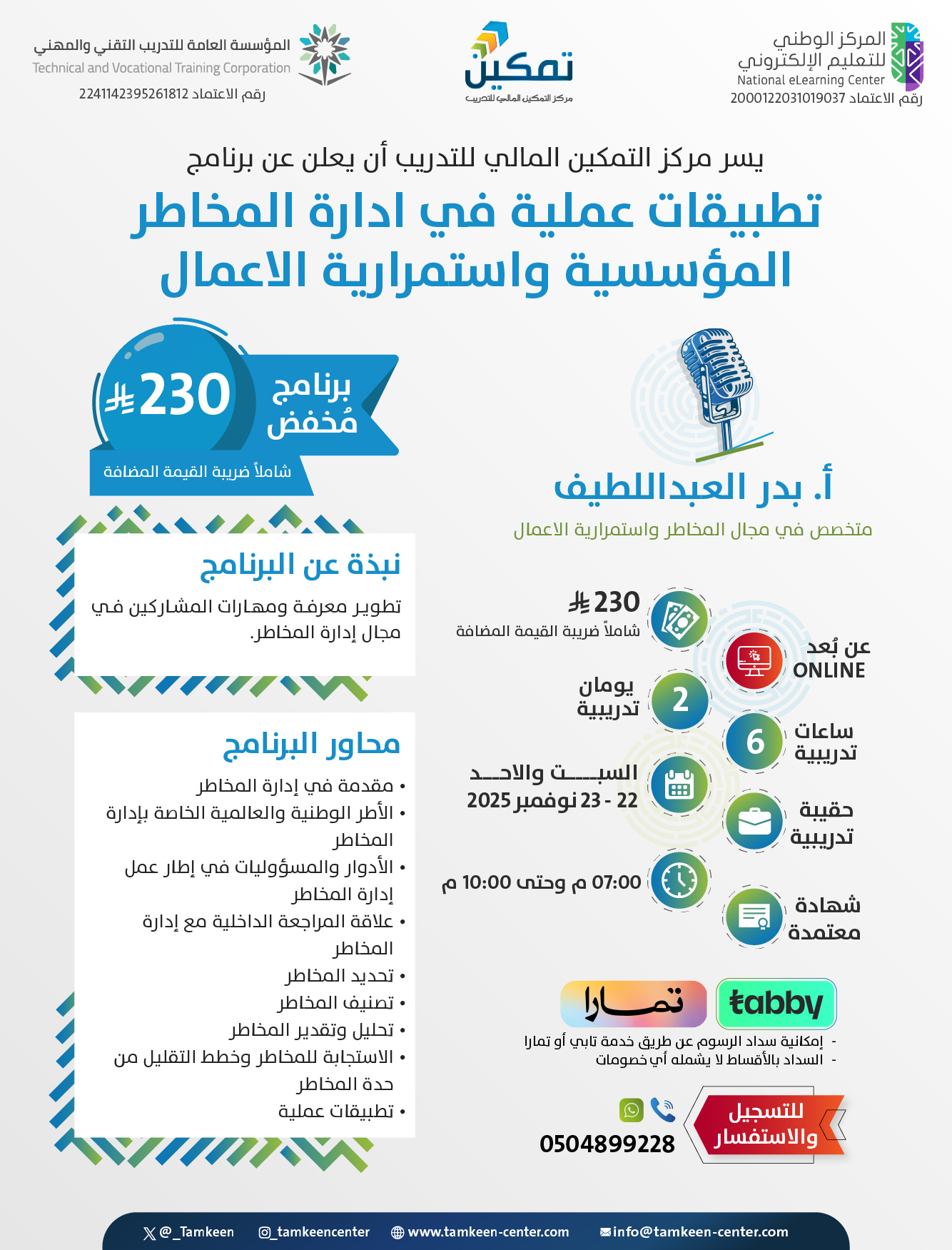 يهدف البرنامج التدريبي في نهايته ان يكون المتدرب قادر على أن يطلع علي المفاهيم الأساسية في إدارة المخاطر مثل سياسة وإجرءات وإدارة المخاطر،وتحديد وتقييم المخاطر والأستجابة لها،وأيضا معرفة المخاطر التي يجب أخذها بعين الأعتبار عند تفعيل وتطوير إدارة المخاطر في المنشأة.